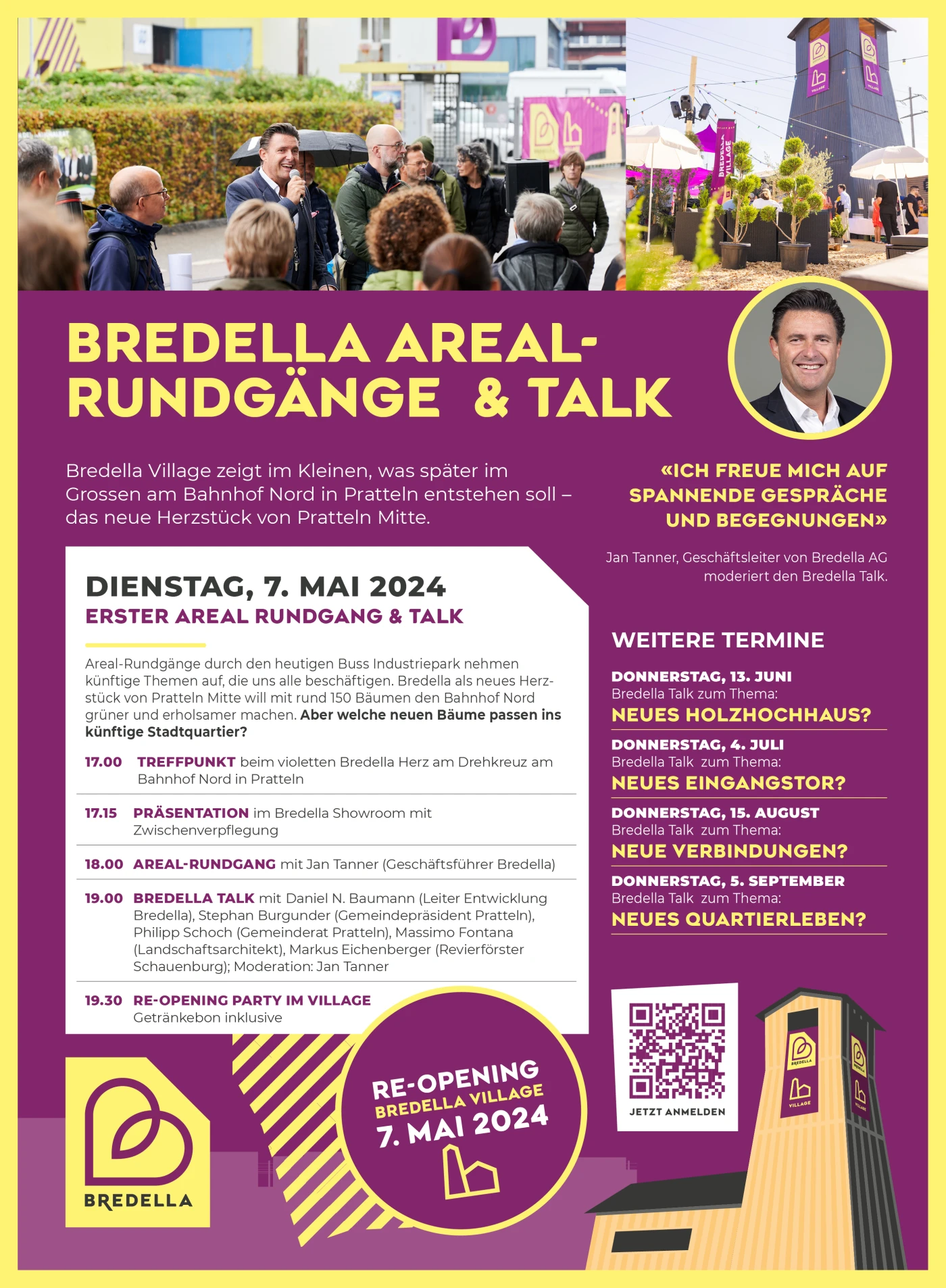Treffpunkt ist das gut sichtbare, violette Herz am Drehkreuz beim Grüssenweglein um 17 Uhr: «Beim Bredella Herz hole ich die angemeldeten Personen ab. Rund 90 Minuten dauert die Veranstaltung. Danach lassen wir den Abend im Bredella Village gemütlich ausklingen. Um 19 Uhr startet der Bredella Talk, den ich selbst moderiere. Im Gespräch mit interessanten Persönlichkeiten und Expertinnen möchte ich Fokusthemen wie zum Beispiel den Bau eines möglichen Holzhochhaus ansprechen», erklärt Jan Tanner. Auch die neue Velounterführung unter dem Bahnhof mit modernsten Veloparkplätzen im ersten Untergeschoss könnte ein Thema sein. Mit Bredella wird die Bahnhofsunterführung für Fussgänger aufgewertet. Besonders hervorzuheben sind auch die neuen, ansprechenden Fussverbindungen durch Bredella, die die umliegenden Quartiere wie Grüssen, Chuenimatt oder die Zentrale gut und angenehm erschliessen. Die heute noch fehlenden Verbindungen, die Pratteln besser vernetzen, werden mit Bredella geschaffen.