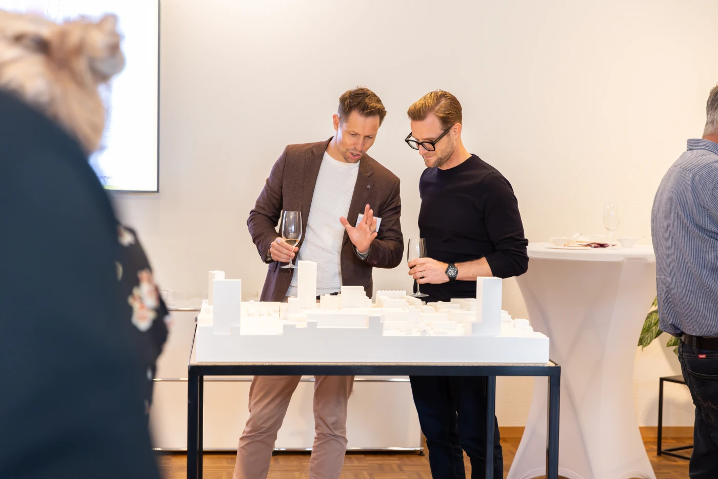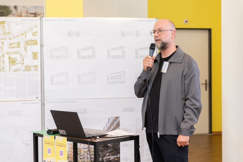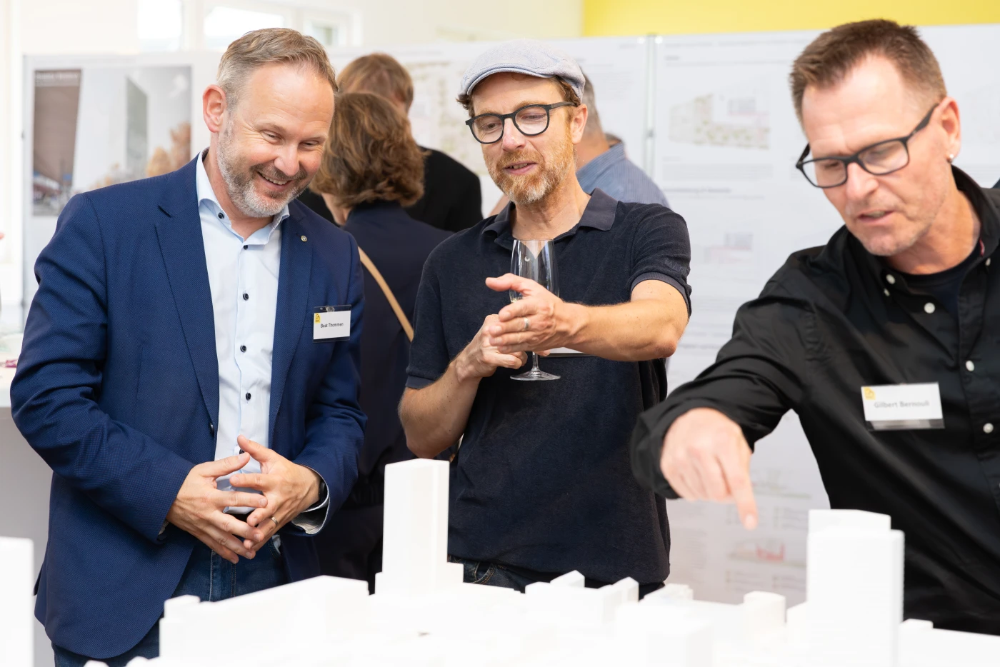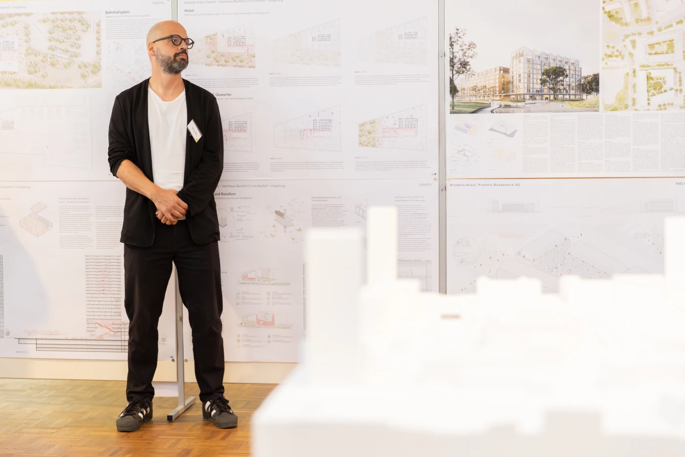 An der Architekturvernissage vom 3. Juni 2025 wurden die Projekte für die Baufelder C1 und A2 offiziell gewürdigt. Gleichzeitig informierte Philipp Schoch, Gemeinderat Pratteln, über den Stand der geplanten Mobilitätsdrehscheibe am Bahnhof Pratteln.
