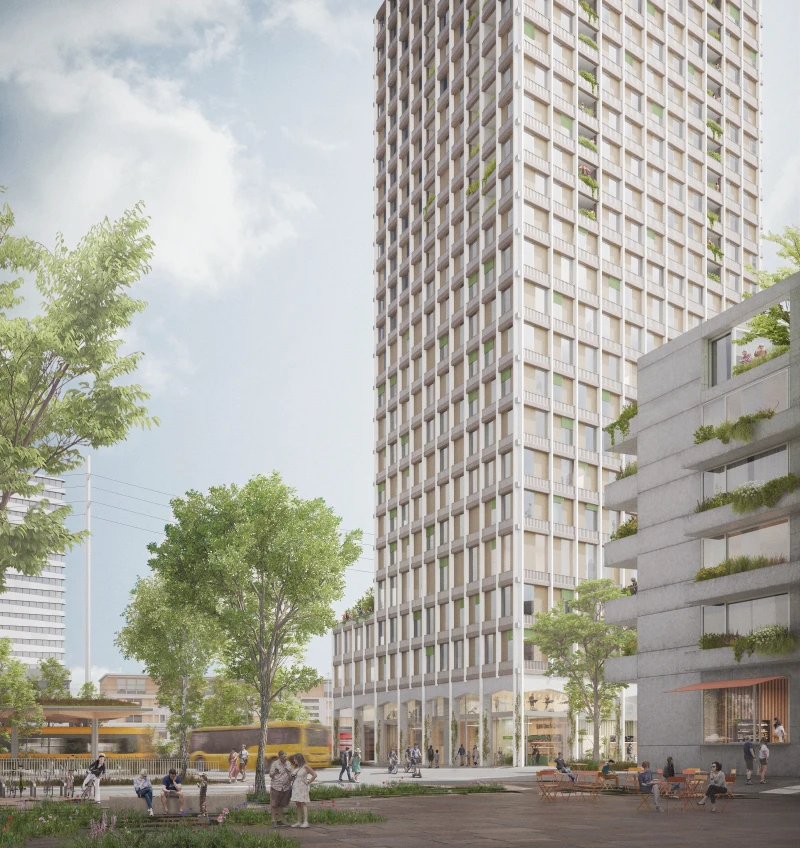 Das prämierte Projekt des digitalen Wettbewerbsverfahrens auf Baufeld C1 überzeugt mit zwei kraftvollen, monolithischen Baukörpern, die durch klare Struktur und starke städtebauliche Präsenz bestechen. Entworfen wurde es von der Arbeitsgemeinschaft Bräunlin Kolb Architekten GmbH, Basel, und Franz und Sue ZT GmbH, Wien, gemeinsam mit den Fachplanenden YEWO LANDSCAPES GmbH, Wien, ZPF Structure AG, Basel, und VIAPLAN AG, Sursee.