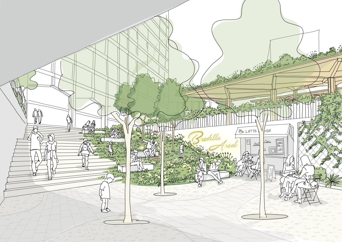 Das Projekt schafft eine präzise räumliche Verzahnung zwischen Stadtraum und Architektur und bildet ein identitätsstiftendes Eingangstor zum neuen Stadtquartier Bredella. Ein zentrales, lichtdurchflutetes Atrium sorgt für intuitive Orientierung und erschliesst vielfältige Nutzungen – von Retail- und Gewerbeflächen über ein Hotel bis hin zu rund 80 Wohnungen. Begrünte Terrassen der Sockelgeschosse sind über das Atrium direkt mit dem vorgelagerten Busbahnhof verbunden.