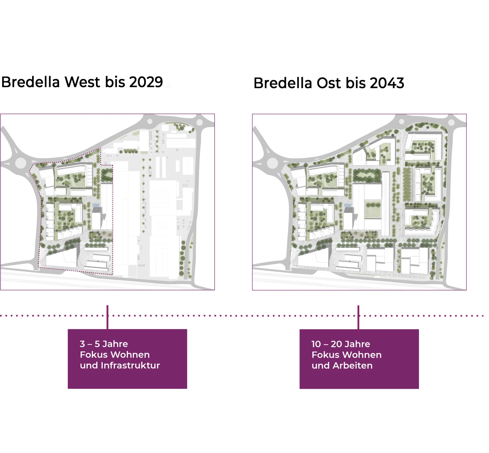 Bredella Ost soll zurzeit noch offen bleiben. Mit den aktuellen Erkenntnissen sowie den Bedürfnissen aus der Bevölkerung, die aktuell im räumlichen Entwicklungskonzept der Gemeinde Pratteln erarbeitet werden, gilt es den Masterplan zu hinterfragen. Ziemlich sicher soll aus dem Bestand entwickelt werden, denn die Gewerbebauten im Osten sind erst vor einigen Jahren gebaut worden.