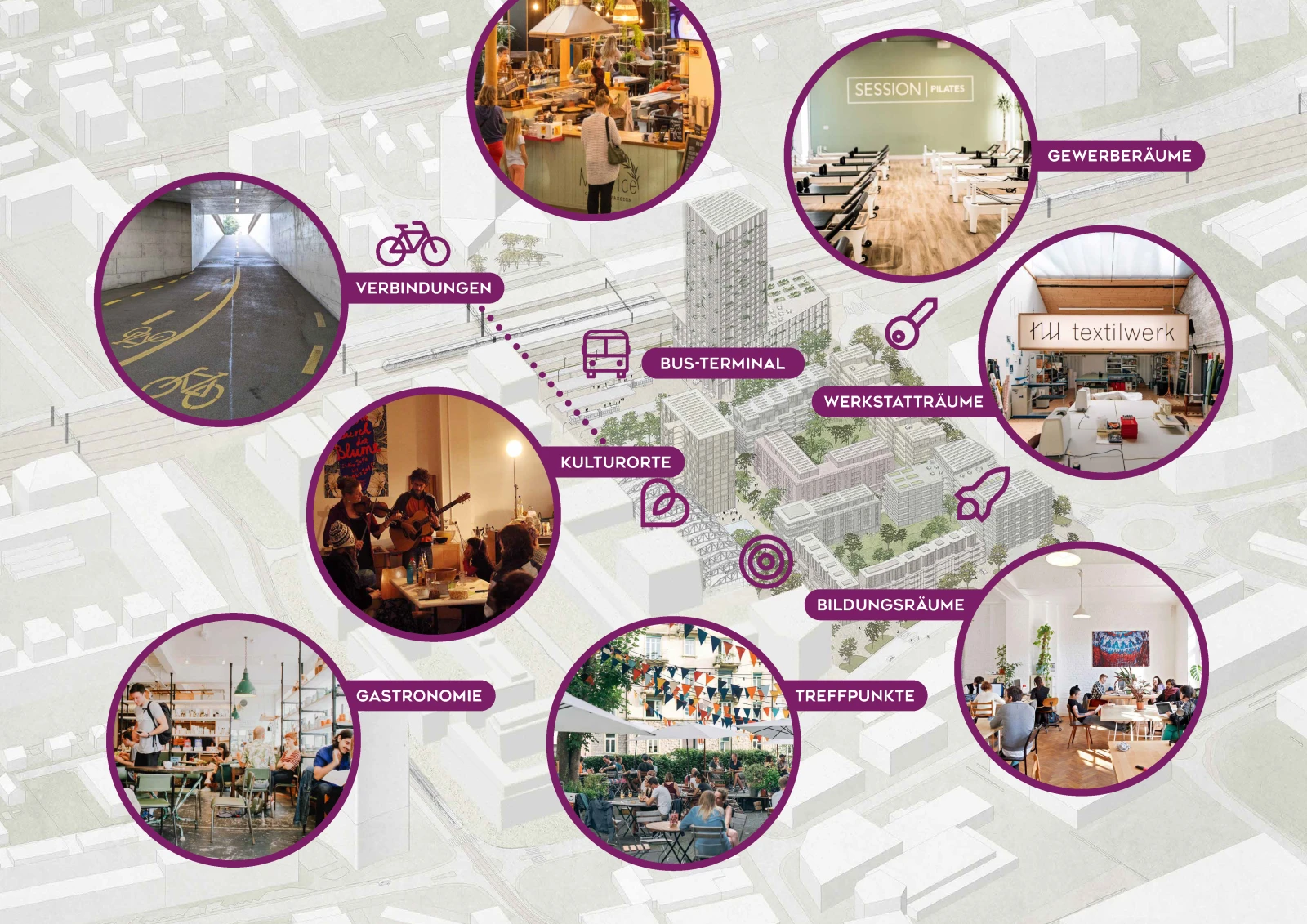 Der Masterplan von Bredella ist auf das Prinzip der 10-Minuten-Stadt ausgerichtet. Das heisst: kompakte Siedlungsstrukturen, Fokus auf Langsamverkehr mit Fussgängerinnen und Velofahrer, lebendig gestaltete Aussenräume und attraktive Erdgeschoss-Nutzungen. Dieser Städtebau bietet die Grundlage für das neue Quartier direkt am Bahnhof Nord von Pratteln. Folgende Bausteine sind von grosser Wichtigkeit für das Quartierleben:
